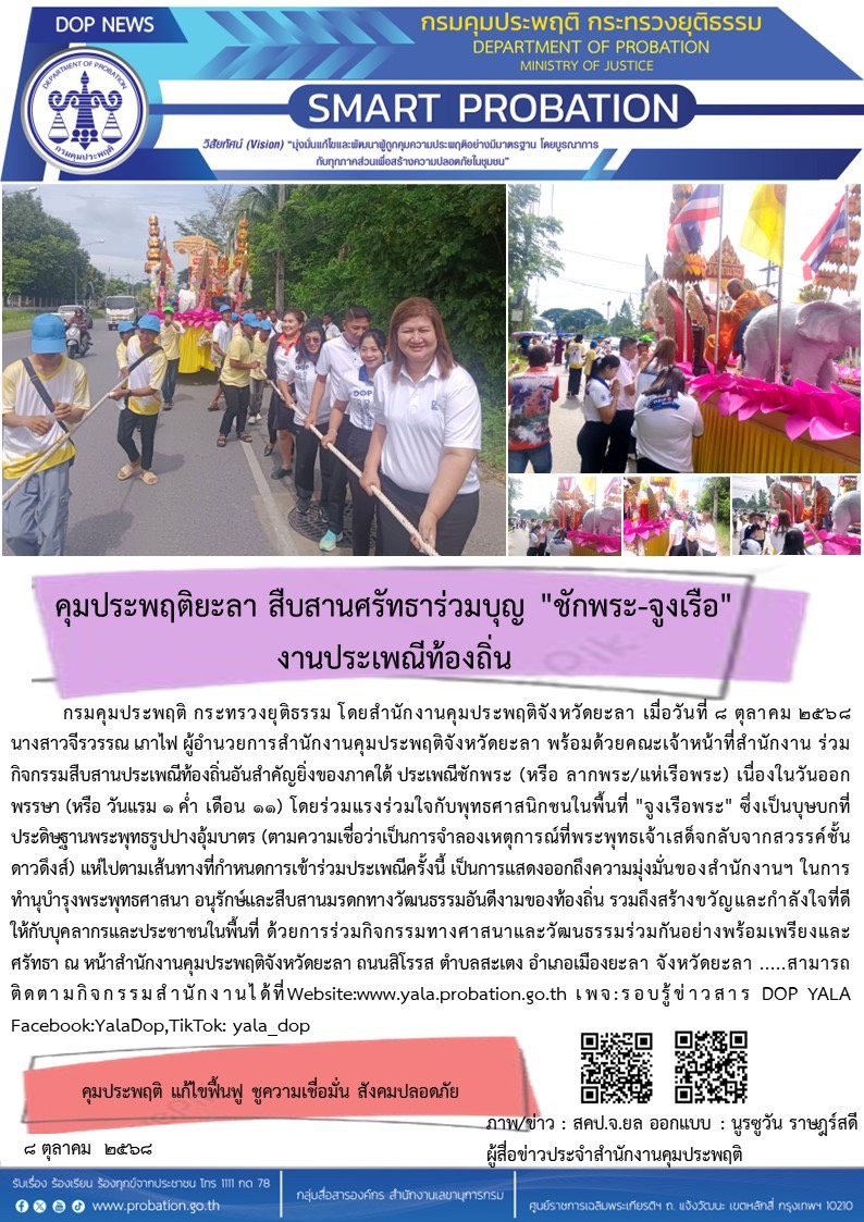 กรมประพฤติ กระทรวงยุติธรรม โดยสำนักงานคุมประพฤติจังหวัดยะลา เมื่อวันที่ 8 ตุลาคม 2568 นางสาวจีรวรรณ เภาไฟ ผู้อำนวยการสำนักงานคุมประพฤติจังหวัดยะลา พร้อมด้วยคณะเจ้าหน้าที่สำนักงานคุมประพฤติร่วมกิจกรรมประเพณีสืบสานท้องถิ่นอันสำคัญยิ่งของภาคใต้ ประเพณีชักพระ (หรือ ลากพระ/แห่เรือพระ) เนื่องวันออกพรรษา (หรือวันแรม 1 ค่ำ เดือน 11) โดยร่วมใจกับพุทธสาสนิกชนในพื้นที่ ”จูงเรือพระ” ณ สำนักงานคุมประพฤจังหวัดยะลา ถนนสิโรรส ตำบลสะเตง อำเภอเมืองยะลา จังหวัดยะลา