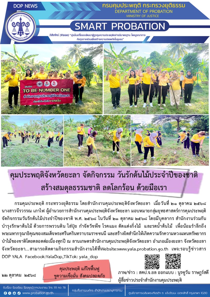 เมื่อวันที่ ๒๑ ตุลาคม ๒๕๖๘ นางสาวจีรวรรณ เภาไฟ ผู้อำนวยการสำนักงานคุมประพฤติจังหวัดยะลา มอบหมายกลุ่มยุทธศาสตร์การคุมประพฤติ จัดกิจกรรมวันรักต้นไม้ประจำปีของชาติ พ.ศ. ๒๕๖๘ ในวันที่ ๒๑ ตุลาคม ๒๕๖๘ โดยมีบุคลากร สำนักงานร่วมกันบำรุงรักษาต้นไม้ ด้วยการพรวนดิน ใส่ปุ๋ย กำจัดวัชพืช โรคแมง ตัดแต่งกิ่งไม้ และรดน้ำต้นไม้